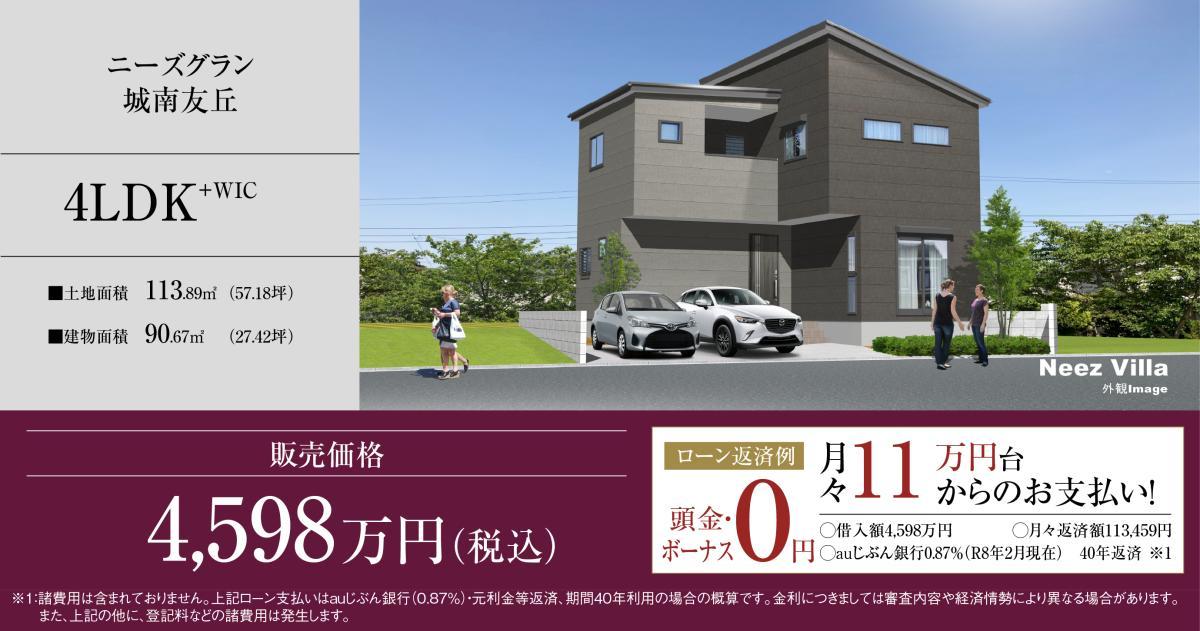 | その他特徴 | 【諸費用】 ・地盤保証料:88,000円(地盤20年) ・瑕疵保険料:73,000円(建物10年) ・水道加入金(20㎜):85,000円 ・ローン控除省エネ住宅証明書(ZEH水準省エネ住宅100,000円) ・建物表示登記::120,000円 |