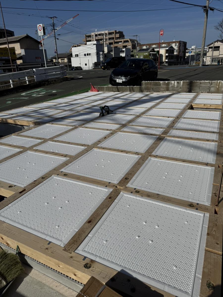 基礎工事とは、地面と建物のつなぎ部分にあたる"基礎"を造るための工事のことです 基礎配筋工事に床下全体にコンクリートを打って作る「ベタ基礎」を採用しています。 布基礎に比べ地盤に接する面が増え、建物の荷重が分散されるため高い耐震性を確保できます。
