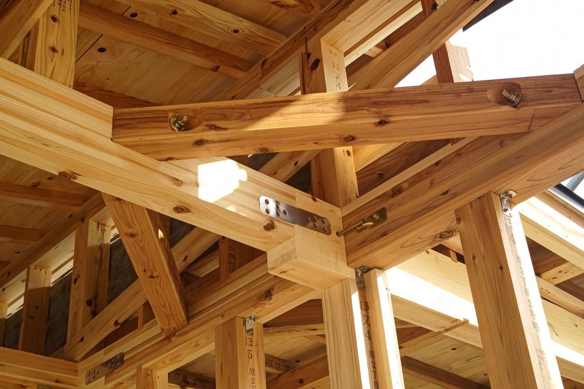 地震や台風などの外力が加わった際、最も力が集中する場所は「接合部」です。 木造住宅において強靭な構造躯体実現するためには接合部の強度を高めることが重要です。 木材と木材を金物で繋ぐことで、接合部の強度を高めています。
