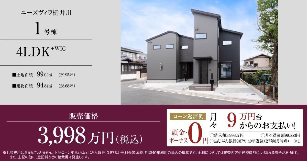土地面積 | ・1号地:98.56㎡(29.81坪) ・2号地:98.57㎡(29.81坪) |