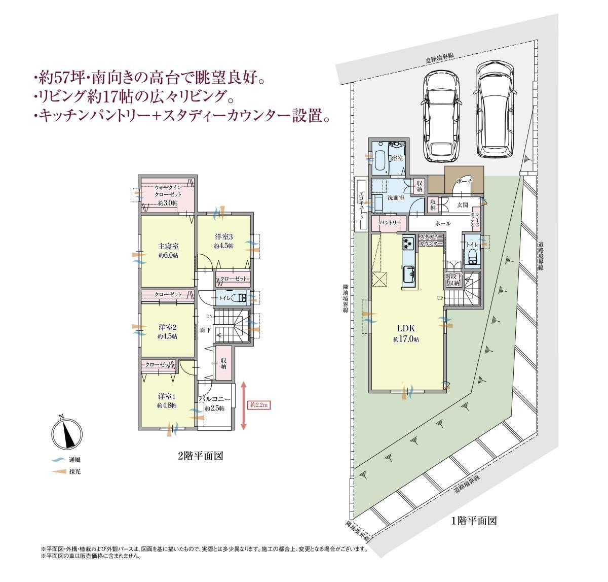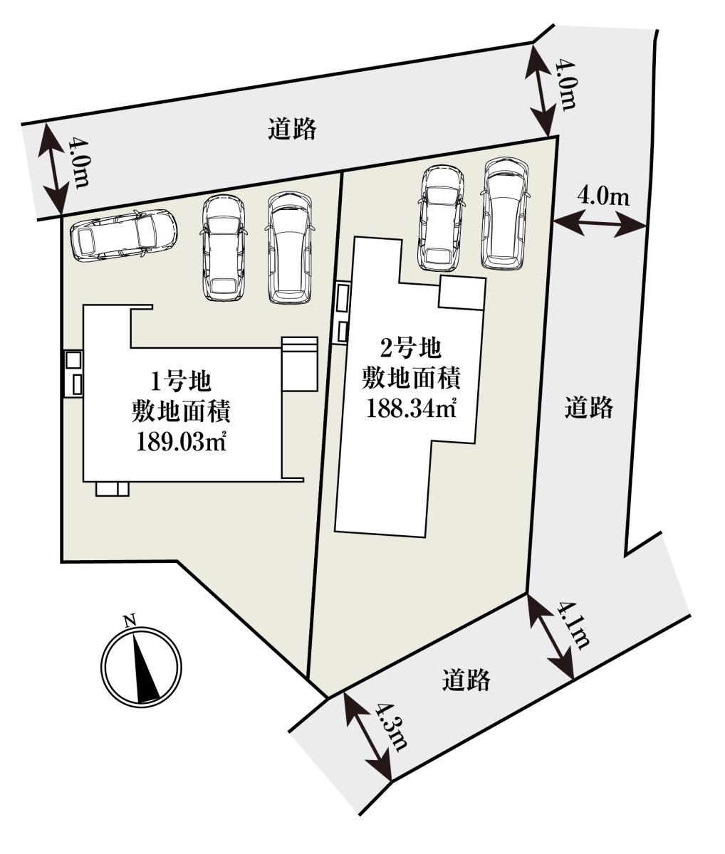 | 土地面積 | ・1号地:189.03㎡(57.18坪) ・2号地:188.34㎡(56.97坪) |
