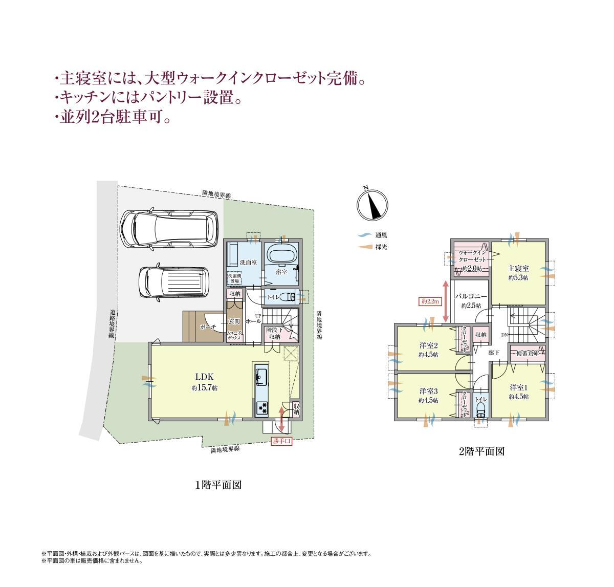 | その他特徴 | 【諸費用】 ・地盤保証料:88,000円(地盤20年) ・瑕疵保険料:73,000円(建物10年) ・水道加入金(20㎜):85,000円 ・ローン控除省エネ住宅証明書(ZEH水準省エネ住宅100,000円) ・建物表示登記::120,000円 |