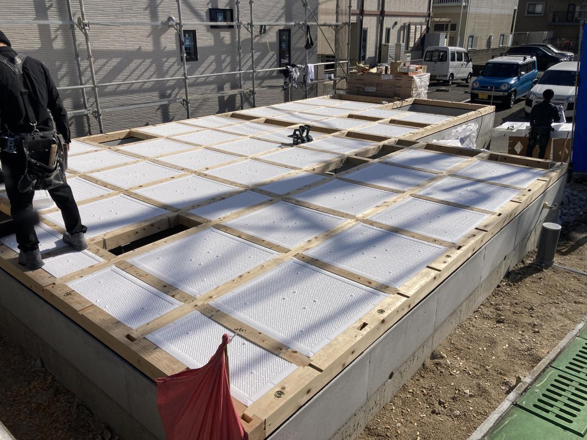 基礎工事とは、地面と建物のつなぎ部分にあたる"基礎"を造るための工事のことです 基礎配筋工事に床下全体にコンクリートを打って作る「ベタ基礎」を採用しています。 布基礎に比べ地盤に接する面が増え、建物の荷重が分散されるため高い耐震性を確保できます。