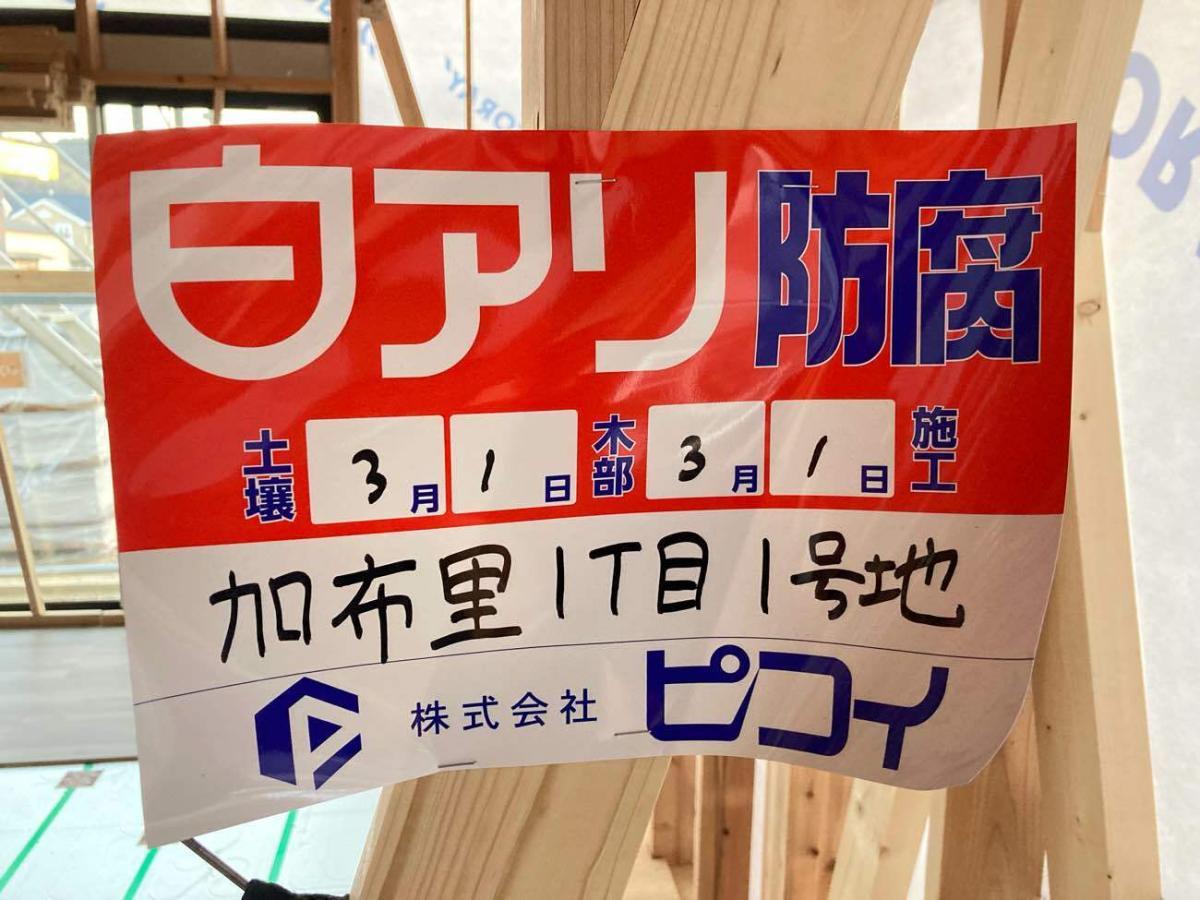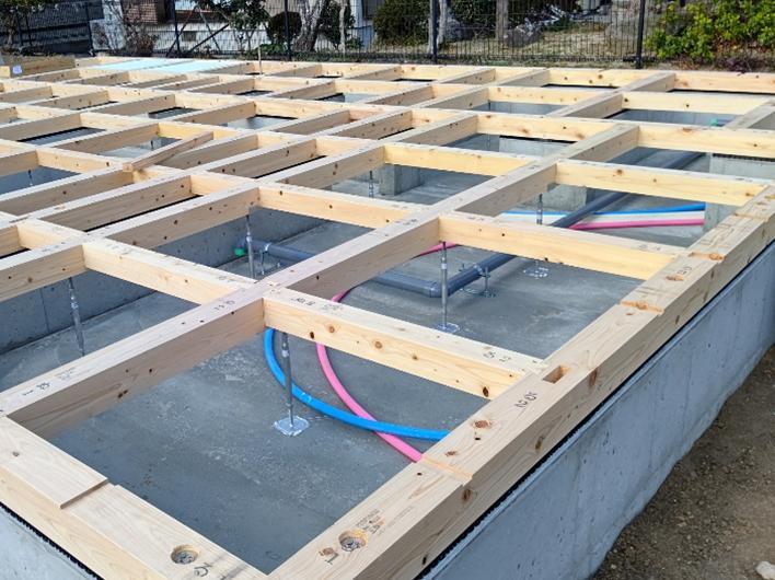 基礎工事とは、地面と建物のつなぎ部分にあたる"基礎"を造るための工事のことです 基礎配筋工事に床下全体にコンクリートを打って作る「ベタ基礎」を採用しています。 布基礎に比べ地盤に接する面が増え、建物の荷重が分散されるため高い耐震性を確保できます。
